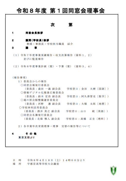 令和8年4月18日(土)14:00から、宇都宮高校大会議室において今年度初めてとなる同窓会理事会が行われました。